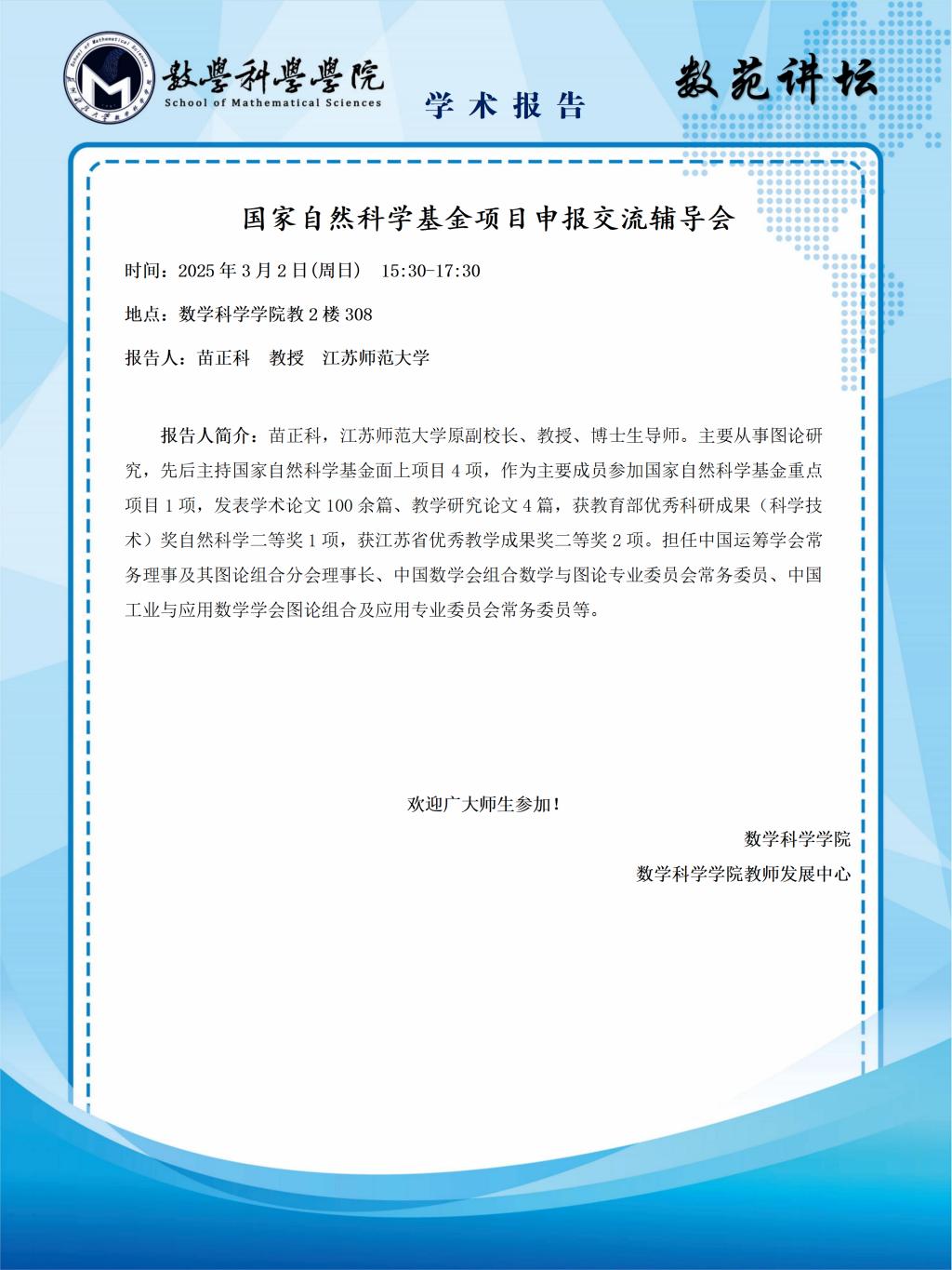 【数苑讲坛】第七讲:国家自然科学基金项目申报交流辅导会